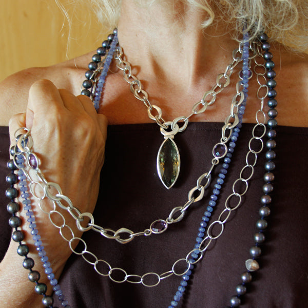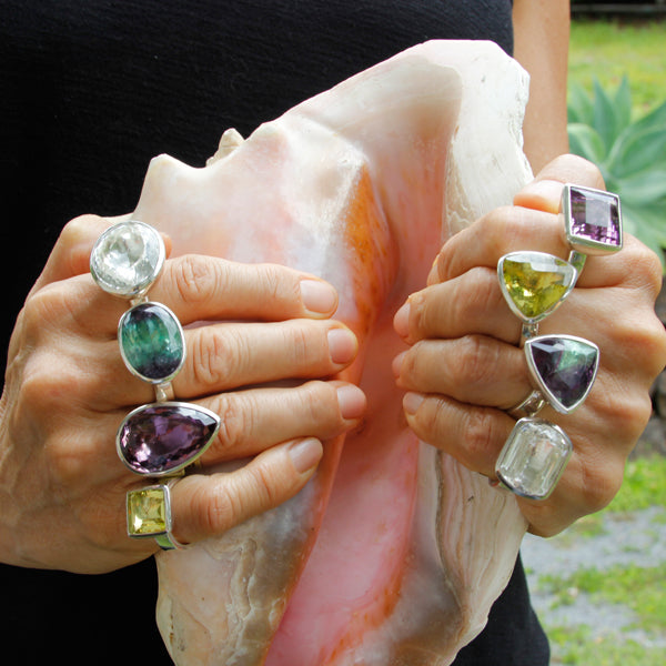 of the materials used. Integrating precious and semi precious Lapis Lazuli, Amethyst, Turquoise, Aquamarine, Topaz (to name a few) plus many other unusual cut gems. All original designs are created by carving in wax or fabricating in precious metal. Cast in silver, the pieces seek strength in both simplicity and weight. All precious and semi-precious stones are individually set by hand.